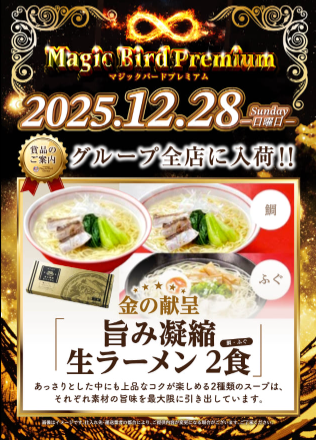 12月28日(日)旨み凝縮生ラーメン 2食【マジックバード東三国】 └オリジナル景品 2025.12.28 マジックバード東三国 大阪府大阪市淀川区東三国5丁目4-1 B'comビル 詳しく見る 大阪市淀川区