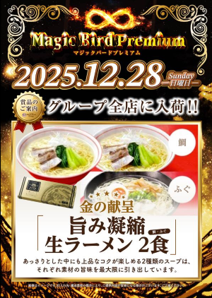 12月28日(日)旨み凝縮生ラーメン 2食【マジックバード東三国】 └オリジナル景品 2025.12.28 マジックバード東三国 大阪府大阪市淀川区東三国5丁目4-1 B'comビル 詳しく見る 大阪市淀川区