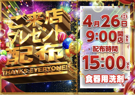 4月26日(日)ご来店プレゼント 食器用洗剤【ダイナム砂川店 ゆったり館】 └オリジナル景品 2026.04.26 ダイナム砂川店 ゆったり館 北海道砂川市空知太西6条6丁目14番地 詳しく見る 砂川市