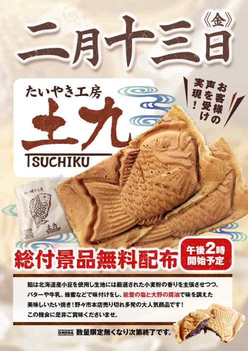 2月13日(金)たいやき工房 土九【エンターテイメントオメガ野々市ホワイトバード】 └オリジナル景品 2026.02.13 エンターテイメントオメガ野々市ホワイトバード 石川県野々市市菅原町11-2 詳しく見る 野々市市