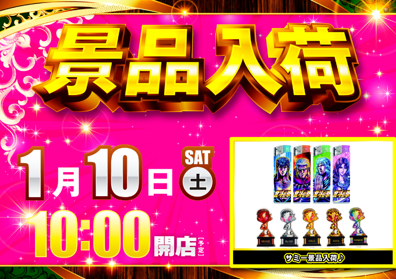 1月10日(土)北斗の拳景品【ダイナム石川金沢専光寺店 ゆったり館】 └オリジナル景品 2026.01.10 ダイナム石川金沢専光寺店 ゆったり館 石川県金沢市専光寺町ヲ113番地1 詳しく見る 金沢市
