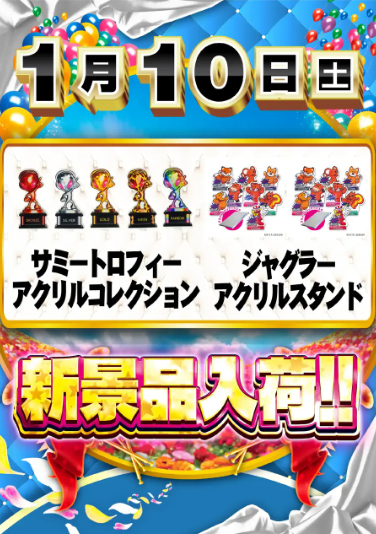 1月10日(土)サミートロフィーアクリルコレクション・ジャグラーアクリルスタンド【ダイナム石川福久店 ゆったり館】 └オリジナル景品 2026.01.10 ダイナム石川福久店 ゆったり館 石川県金沢市南森本町ホ121番地3 詳しく見る 金沢市