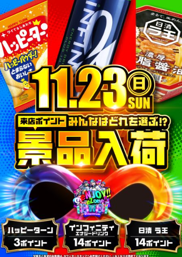 11月23日(日)ハッピーターン・インフィニティ エナジードリンク・日清 ラ王【イーゾーン富山店】 └オリジナル景品 2025.11.23 イーゾーン富山店 富山県富山市堀川町355-7 詳しく見る 富山市
