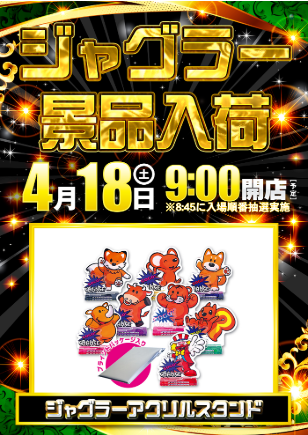 4月18日(土)ジャグラーアクリルスタンド【ダイナム愛知名古屋稲永店 ゆったり館】 └オリジナル景品 2026.04.18 ダイナム愛知名古屋稲永店 ゆったり館 愛知県名古屋市港区稲永二丁目13番43号 詳しく見る 名古屋市港区