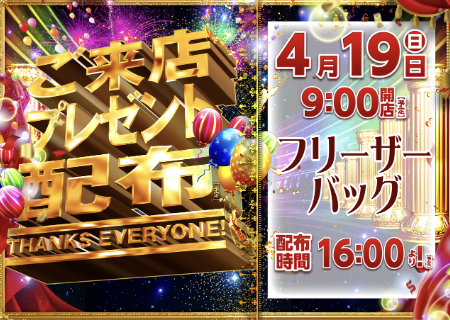 4月19日(日)ご来店プレゼント フリーザーバッグ【ダイナム静岡袋井店 ゆったり館】 └オリジナル景品 2026.04.19 ダイナム静岡袋井店 ゆったり館 静岡県袋井市堀越字左ノ前531番地1 詳しく見る 袋井市