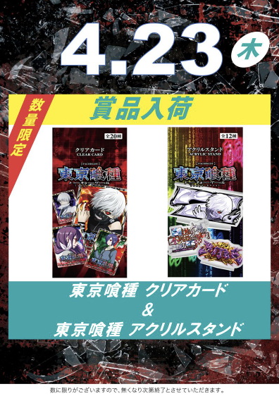 4月23日(木)東京喰種 クリアカード&アクリルスタンド【QUICK7大須店】 └オリジナル景品 2026.04.23 QUICK7大須店 愛知県名古屋市中区大須3-31-11 詳しく見る 名古屋市中区