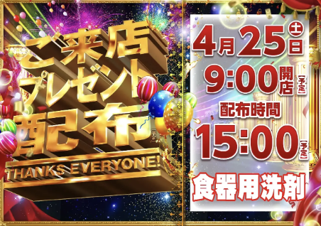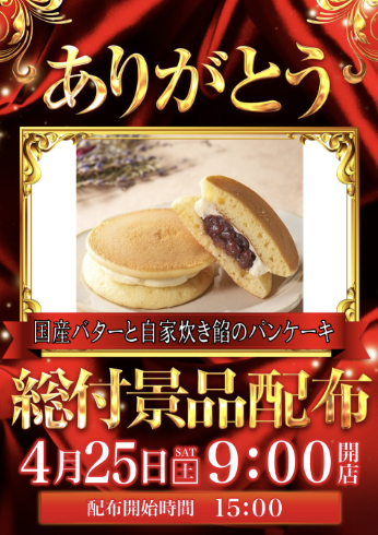 4月25日(土)総付景品 国産バターと自家炊き餡のパンケーキ【ゴールデン大宝川沿店】 └オリジナル景品 2026.04.25 ゴールデン大宝川沿店 北海道札幌市南区川沿2条2-5-28 詳しく見る 札幌市南区