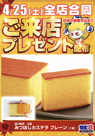 4月25日(土)ご来店プレゼント みつぼしカステラプレーン(1切)【ライジング琴似】 └オリジナル景品 2026.04.25 ライジング琴似 北海道札幌市西区琴似4条1-580-1 詳しく見る 札幌市西区