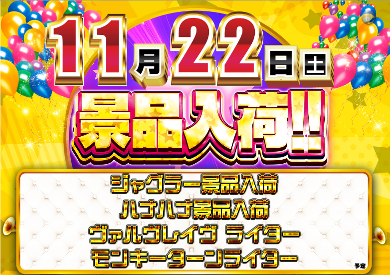 11月22日(土)ジャグラー・ハナハナ・ヴァルヴレイヴ・モンキーターン景品【ダイナム五泉店】 └オリジナル景品 2025.11.22 ダイナム五泉店 新潟県五泉市太田字柳仲971番地1 詳しく見る 五泉市