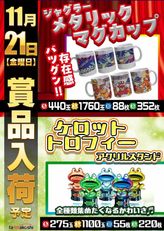 11月21日(金)ジャグラーメタリックマグカップ・ケロットトロフィーアクリルスタンド【玉越 春日井インター店】 └オリジナル景品 2025.11.21 玉越 春日井インター店 愛知県春日井市大泉寺町581 詳しく見る 春日井市