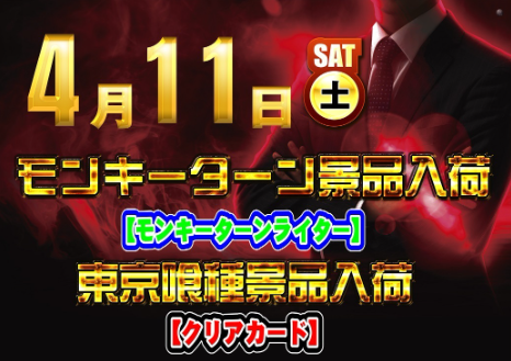 4月11日(土)モンキーターンライター・東京喰種クリアカード【ダイナム岐阜各務原鵜沼店 ゆったり館】 └オリジナル景品 2026.04.11 ダイナム岐阜各務原鵜沼店 ゆったり館 岐阜県各務原市鵜沼羽場町五丁目170番地 詳しく見る 各務原市