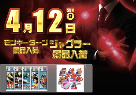4月12日(日)モンキーターン・ジャグラー景品【ダイナム福岡直方店 ゆったり館】 └オリジナル景品 2026.04.12 ダイナム福岡直方店 ゆったり館 福岡県直方市大字上新入字畦ノ元1862番地1 詳しく見る 直方市