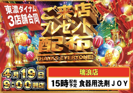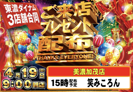 4月19日(日)ご来店プレゼント 笑みころん【ダイナム美濃加茂店 ゆったり館】 └オリジナル景品 2026.04.19 ダイナム美濃加茂店 ゆったり館 岐阜県美濃加茂市森山町2丁目4番27号 詳しく見る 美濃加茂市