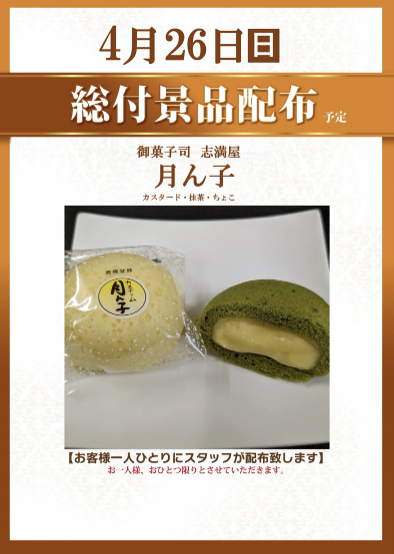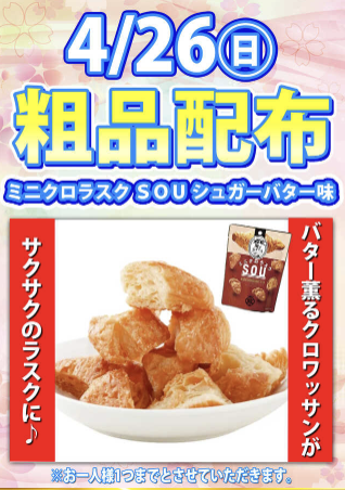 4月26日(日)粗品配布 ミニクロラスクSOUシュガーバター味【ラッキープラザ堀田店】 └オリジナル景品 2026.04.26 ラッキープラザ堀田店 愛知県名古屋市瑞穂区神穂町1-22 詳しく見る 名古屋市瑞穂区