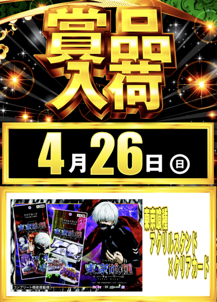 4月26日(日)東京喰種 アクリルスタンド×クリアカード【ダイナム大阪貝塚店 ゆったり館】 └オリジナル景品 2026.04.26 ダイナム大阪貝塚店 ゆったり館 大阪府貝塚市澤931番地2 詳しく見る 貝塚市