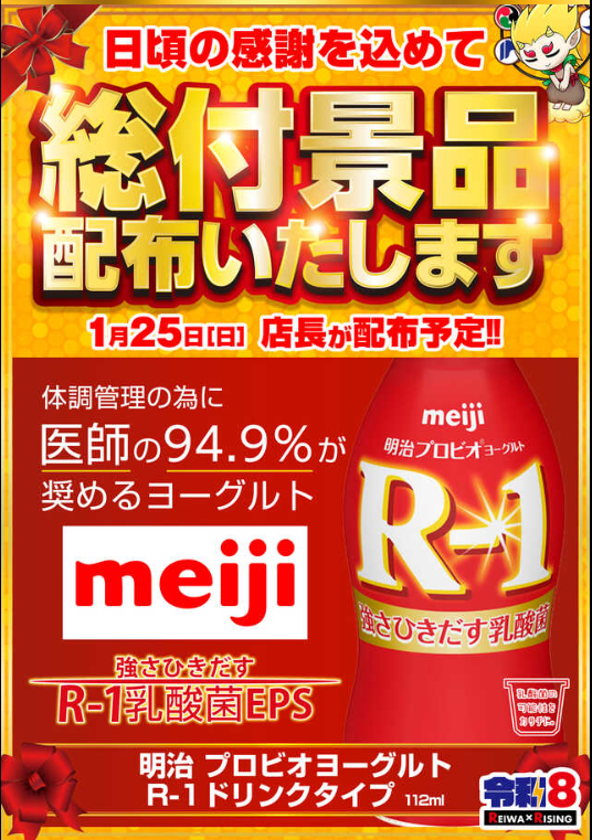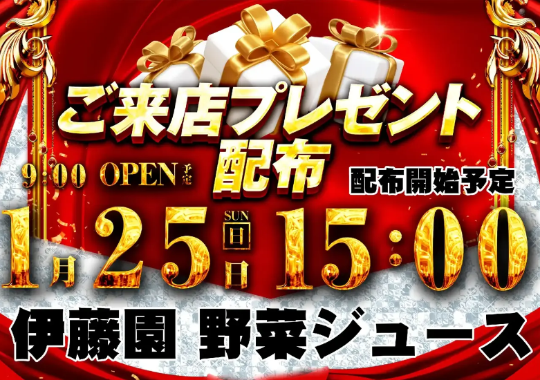 1月25日(日)伊藤園 野菜ジュース【ダイナム秋田臨海店 ゆったり館】 └オリジナル景品 2026.01.25 ダイナム秋田臨海店 ゆったり館 秋田県秋田市寺内蛭根一丁目16番20号 詳しく見る 秋田市