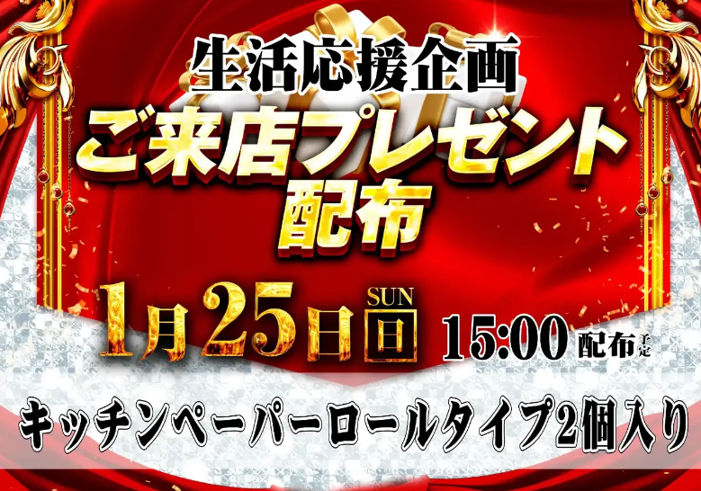 1月25日(日)キッチンペーパーロールタイプ2個【ダイナム秋田御所野店 ゆったり館】 └オリジナル景品 2026.01.25 ダイナム秋田御所野店 ゆったり館 秋田県秋田市御所野下堤三丁目2番1号 詳しく見る 秋田市