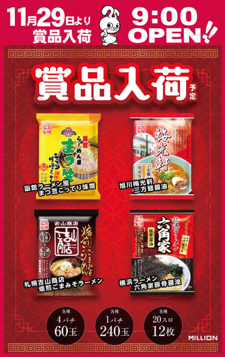 11月29日(土)函館ラーメン屋まつ笠こってり味噌・旭川梅光軒三方麺醤油・札幌吉山商店焙煎ごまみそラーメン・横浜ラーメン六角家豚骨醤油【ミリオン美馬店】 └オリジナル景品 2025.11.29 ミリオン美馬店 徳島県美馬市美馬町字願勝寺60-1 詳しく見る 美馬市