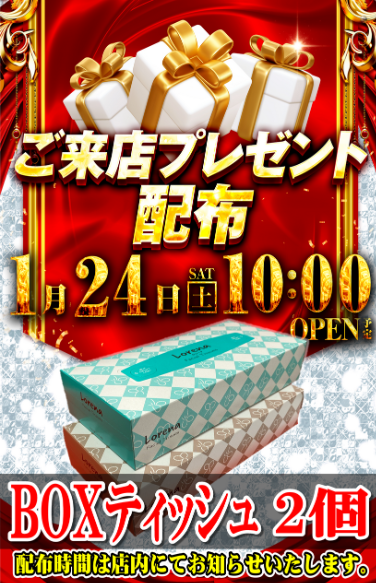 1月24日(土)BOXティッシュ 2個【ダイナム群馬桐生店 ゆったり館】 └オリジナル景品 2026.01.24 ダイナム群馬桐生店 ゆったり館 群馬県桐生市広沢町6丁目283番地1 詳しく見る 桐生市