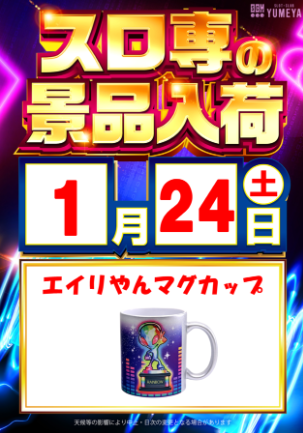 1月24日(土)エイリやん マグカップ【SLOT・CLUB YUMEYA夢屋石堂店】 └オリジナル景品 2026.01.24 SLOT・CLUB YUMEYA夢屋石堂店 青森県八戸市石堂2-10-16 詳しく見る 八戸市