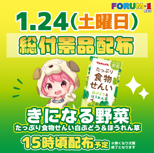 1月24日(土)きになる野菜 たっぷり食物せんい白ぶどう&ほうれん草【FORUM-1青森店】 └オリジナル景品 2026.01.24 FORUM-1青森店 青森県青森市千富町2-1-5 詳しく見る 青森市