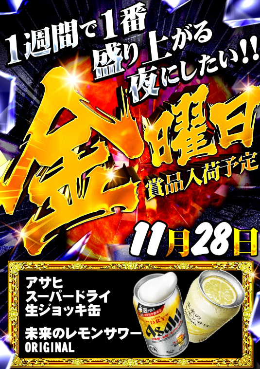 11月28日(金)アサヒスーパードライ生ジョッキ缶・未来のレモンサワーORIGINAL【パチンコプラザ ラ・カータ大宮駅前店】 └オリジナル景品 2025.11.28 パチンコプラザ ラ・カータ大宮駅前店 埼玉県さいたま市大宮区桜木町1-407 詳しく見る さいたま市大宮区