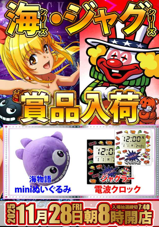 11月28日(金)海物語 miniぬいぐるみ・ジャグラー 電波クロック【ベガスベガス大和町店】 └オリジナル景品 2025.11.28 ベガスベガス大和町店 宮城県仙台市若林区大和町5-31-1 詳しく見る 仙台市若林区