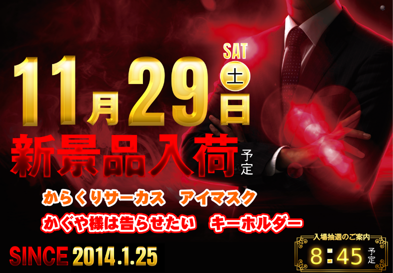 11月29日(土)からくりサーカス アイマスク・かぐや様は告らせたい キーホルダー【ダイナム山口宇部店 ゆったり館】 └オリジナル景品 2025.11.29 ダイナム山口宇部店 ゆったり館 山口県宇部市大字中野開作448番地1 詳しく見る 宇部市