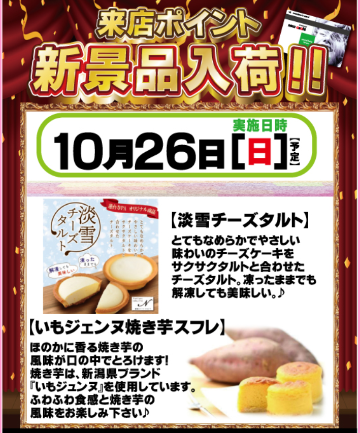 10月26日(日)淡雪チーズタルト・いもジェンヌ焼き芋スフレ【ニューアサヒ岡谷南店】 └オリジナル景品 2025.10.26 ニューアサヒ岡谷南店 長野県岡谷市長地権現町4-10-8 詳しく見る 岡谷市