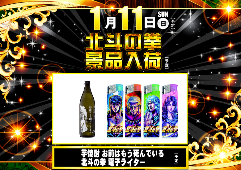 1月11日(日)芋焼酎 お前はもう死んでいる・北斗の拳 電子ライター【ダイナム香川東かがわ店 ゆったり館】 └オリジナル景品 2026.01.11 ダイナム香川東かがわ店 ゆったり館 香川県東かがわ市川東881番地 詳しく見る 東かがわ市