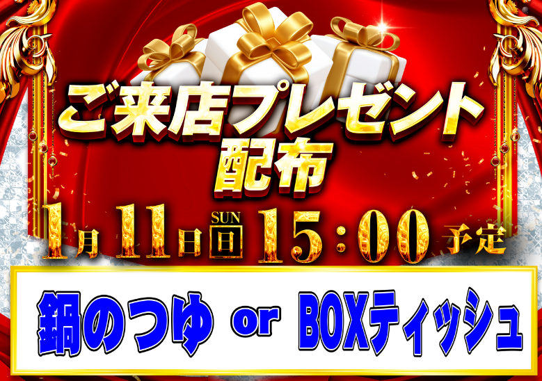 1月11日(日)鍋のつゆ・BOXティッシュ【ダイナム徳島鴨島店 ゆったり館】 └オリジナル景品 2026.01.11 ダイナム徳島鴨島店 ゆったり館 徳島県吉野川市鴨島町牛島字中開西2970番地18 詳しく見る 吉野川市